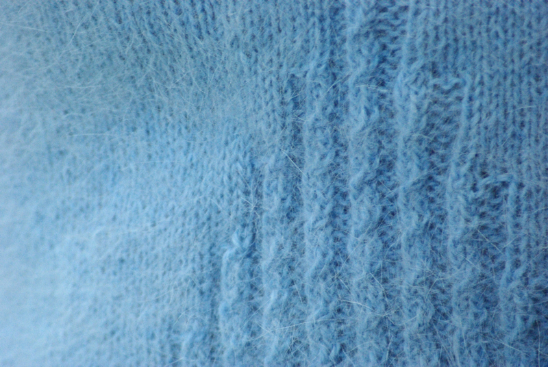 I have a second big cone of this yarn, and I think I'll leave what I've knitted so far, and start again from the second cone. I'm thinking I'll adjust the line of the "peak" so that the cabling extends higher up and the transition to stockinette forms a kind of empire waist - always a flattering line. I may decrease the amount of ease slightly, because the angora is very fluffy and doesn't have much drape, a combination that adds weight: I guess there's a reason all those angora sweaters in the 50s were form-fitting. Between the empire waist and the snugger fit, part of my issue will be solved: I don't think the current version is all that flattering, despite the waist shaping working out pretty much perfectly.