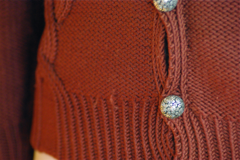 At this point, I was pretty pleased with how things were coming. The bold, bulky qualities of the cable were holding their own against the variegation in the yarn, the stitch definition at my chosen gauge was excellent, and the fabric I was getting was deliciously cozy. And at this relatively light weight, even such a bulky cable is capable of co-existing with a fitted garment. I especially like that this cable, although it has a completely different feel from the Breeze cable, preserves a nautical aura from the original. Whereas Breeze feels to me like something that would be worn by a young girl being taken out on a sail boat in the early summer, this cable seems more likely to be worn by the person actually sailing the thing. They are thematically linked, but each have their different flavors.